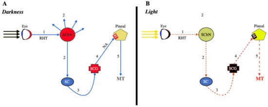 Briefly, the signals produced in the retina by the absence of light are sent through the retino-hypothalamic tract to a primary oscillator, the suprachiasmatic nucleus, which after being activated sends a series of signals to the brain but also to the spinal cord and from this to the sympathetic chain until reaching the superior cervical ganglion, which, in turn, when there is darkness, sends stimulating sympathetic signals to the pineal gland to induce the synthesis and release of MT into the circulation (Figure 1A). Conversely, photic stimulation of the retina leads to the interruption of this pathway, thus producing the abolition of the synthesis and secretion of MT (Figure 1B).
