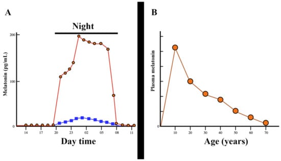 Evolution of melatonin secretion during the day and throughout life. (A): Plasma melatonin levels rise abruptly as the night begins, but this high increase comes from the pineal gland (red circles and red lines), while extra-pineal melatonin only experiences a small increase in plasma (blue squares and blue lines). When the darkness disappears, plasma levels of melatonin are virtually undetectable. However, even during high nocturnal secretion, a flash of 2000 lux sustained for one minute leads to the abolition of melatonin secretion (not shown in Figure). (B): The nocturnal secretion of melatonin is very low at birth, but then its pineal production increases continuously until it reaches its peak at puberty. From this age, the pineal production of melatonin undergoes a progressive decrease until it is practically undetectable in the elderly. (The red circles and red lines indicate the average amount of pineal melatonin production throughout life). Modified from reference [45].