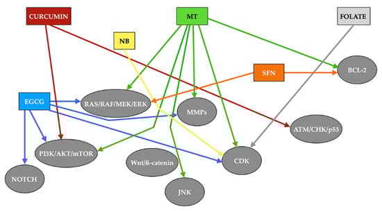 Signaling pathways stimulated by different epidrugs. Rectangles of different colors indicate each of the drugs analyzed, while arrows with the same color as the rectangle from which they indicate the signals induced by each of the drugs. MT: melatonin. NB: sodium butyrate. ECGC: epigallocatechin-3-gallate. SFN: sulforaphane. MMPs: matrix metalloproteinases. CDK: cyclin-dependent kinase. ATM: ataxia telangiectasia mutated. CHK: check point kinase.
