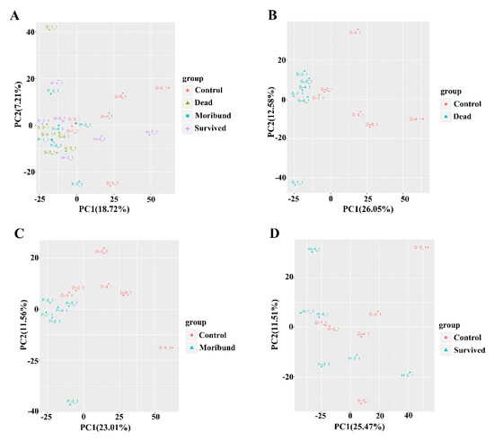 PCA analysis of all the samples (A). PCA analysis of specific samples from dead group (B), moribund group (C), and survived group (D) of Macrobrachium nipponense.