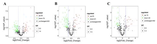 Volcanic map of differential metabolites from three comparisons between control and dead group (A), control and moribund group (B), and control and group (C) of Macrobrachium nipponense. The x- and y-axis are the log2-fold change and the log10 p-value of student’s T test between the two compared groups. Red points represent up-regulated metabolites. Green points represent down-regulated metabolites. Black points represent detected but insignificant differences.