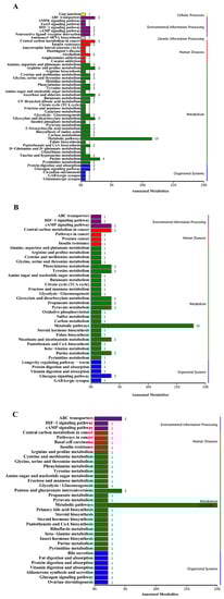 KEGG enrichment of different metabolites between control and dead group (A), control and moribund group (B), and control and survived group (C) in Macrobrachium nipponense.