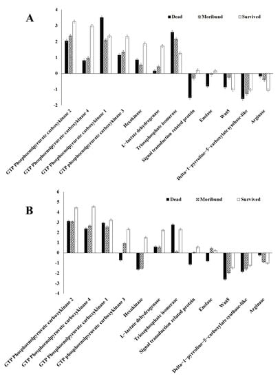 Combined with the previous transcriptome database (PRJNA656359) [], 12 differential genes (DEGs) were identified based on the common differential metabolites in the three comparative metabolome libraries (control vs. survived, control vs. moribund, control vs. dead). These DEGs were selected to validate the metabolism results. The tissues used for qRT-PCR were the same as those used in the metabolome. In subsequent experiments, the extraction of total RNA, the synthesis of cDNA, and the designs of qRT-PCR primer were completed as described in previous reports []. The primers for qRT-PCR are listed in Table S1. In line with previous studies, eukaryotic translation initiation factor 5A (EIF) was selected as the reference gene for qRT-PCR []. Three replications were used for each sample. The 2–ΔΔCT method was chosen to calculate the expression of the selected genes.