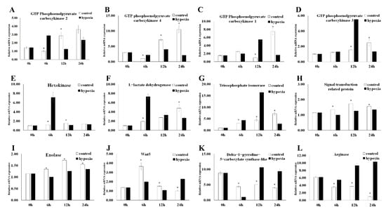 Expression of selected genes in Macrobrachium nipponense at different time points under hypoxia by qRT-PCR. (A): Mn-PEPCK2, (B): Mn-PEPCK4, (C): Mn-PEPCK1, (D): Mn-PEPCK3, (E) Mn-HK, (F) Mn-LDH, (G) Mn-TPI, (H) Mn-STP, (I) Mn-ENO, (J) Mn-Wnt5, (K) Mn-P5CS, (L) Mn-ARG. Data are shown as means ± SD of three replicates in various tissues. Statistical analyses are shown with paired t test. Data indicated with asterisks are significantly different (p < 0.05) between treatment and control groups.