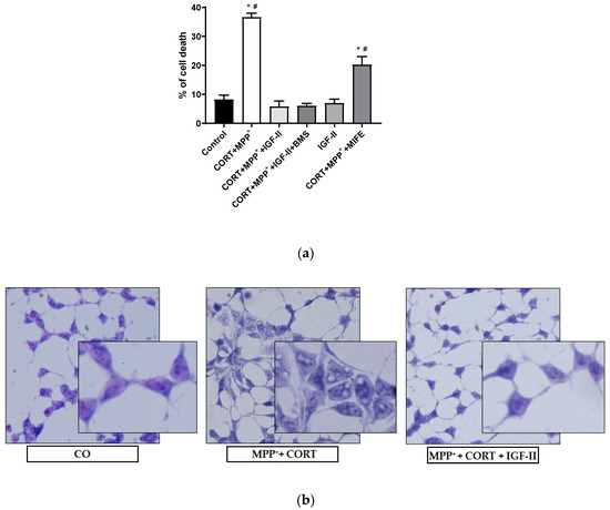 Figure 1a shows the analysis of LDH released after incubation with the two drugs MPP+ and CORT. We found a dramatic 4.5-fold increase in LDH levels compared to those in controls (p < 0.05); co-incubation with IGF-II and both drugs prevented the release of LDH (p < 0.05), whereas incubation in the presence of BMS did not modify the effect of IGF-II. Cells solely in the presence of IGF-II showed similar LDH levels to those found in control, and co-incubation with MIFE and both drugs partially decreased the cell death found with the administration of both drugs (2.5-fold increase of LDH versus control cells, p < 0.05). Regarding the study of cell morphology, the analysis of the Giemsa-stained images (Figure 1b) showed strong morphological changes in cells exposed to CORT and MPP+ incubation compared to control, with clear heterogeneity in cell shape and swelling, and with shrunken condensed pyknotic nuclei. After the administration of IGF-II in combination with both drugs, cells showed a morphology similar to that found in the control cells.