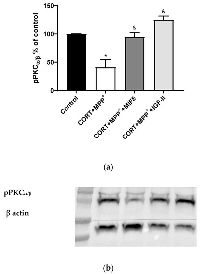 It is known that PKC is modulated by GC, ROS, and IGF-II [42,43,44]. The administration of both drugs together produced a clear decrease in pPKCα/β expression of 58.8% after 2.5 h of incubation versus control cells (p < 0.05, Figure 6), whereas the co-treatment with MIFE and both drugs or the inclusion of IGF-II in the treatment led PKCα/β expression to values close to those of the control cells (p < 0.05).