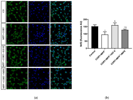 Study of Nrf2 expression in SN4741 neuronal cells after 2.5 h of incubation with the combination of corticosterone and MPP+ (CORT + MPP+) in the presence or absence of IGF-II. (a) Representative immunocytochemistry stain for DAPI and Nrf2 (63X). CO: control cells; (b) Quantification of Nrf2 immunofluorescence. Fluorescent intensity was estimated by number of cells per field. Data from three independent experiments were combined and presented as mean ± SEM. * p < 0.05 compared to control cells; & p < 0.05 compared to CORT + MPP+ co-incubated cells.