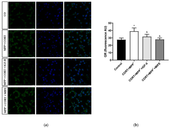 The nuclear GR expression could be considered a possible regulator of stress-related gene expression patterns [45]. Treatment with CORT and MPP+ produced an increase in nuclear GR expression compared to what was found in the control cells (41.4%, p < 0.05), whereas IGF-II co-incubation led CORT+MPP+ nuclear GR expression induction to values close to the control levels (p < 0.05); in the same way, the values found after co-incubation of both drugs with MIFE were close to the control (p < 0.05, Figure 8 and Supplementary Figure S1), inhibiting the nuclear translocation of the GR. No differences were observed in total expression between conditions.