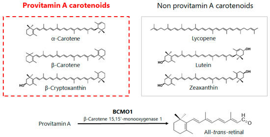 Chemical structure of dietary provitamin A and non-provitamin A carotenoids normally present in human blood, and metabolic conversion of provitamin A to all-trans-retinal by β-carotene 15,15′-monooxygenase 1 (BCMO-1): Carotenoids are defined as yellow to red natural colorants bio-synthesized by plants and algae, characterized to express high anti-oxidative activities, and found to have physiologically defensive functions on visual performance, life-style related diseases and cancers. Six kinds of dietary carotenoids are normally present in human blood.