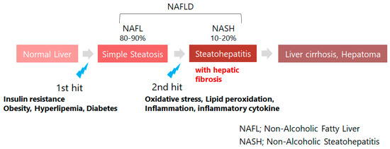 NAFLD is closely associated with obesity, diabetes, dyslipidemia, and other lifestyle-related diseases and is also referred to as the hepatic phenotype of MS. The rapid increase in the number of patients has become a social problem, where 25% of the global adult population is reported to be affected with NAFLD [26,27]. Nevertheless, no solid treatment has been established to date. The 80 to 90% of patients with NAFLD have simple fatty liver (NAFL) with no progression, and 10 to 20% progress to non-alcoholic steatohepatitis (NASH) with liver fibrosis, which becomes severe, leading to cirrhosis and liver cancer (Figure 2). The “two-hit theory” has been widely recognized, in which insulin resistance and oxidative stress are deeply involved in the pathogenesis of NAFLD [28,29], and serum provitamin A concentration is inversely correlated with these factors and the risk of developing NAFLD (Section 2). Provitamin A is a source of vitamin A (retinoid) through metabolic conversion in vivo, while abnormalities in retinoid metabolism in vivo are known to contribute to NAFLD and other liver diseases [26]. Here we would like to discuss the relationship between abnormal retinoid metabolism and provitamin A.
