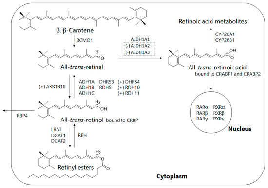 Intracellular metabolic pathway of retinoid in the liver: The all-trans-retinol binds to cellular retinol-binding protein (CRBP) and is esterized by lecithin retinol acyltransferase (LRAT) and diacylglycerol acyltransferases (DGAT1, DGAT2) for intracellular storage, whereas retinol bound with retinol-binding protein 4 (RBP4) is transported into other tissues via blood circulation. Retinol is oxidized into all-trans-retinoic acid in the liver via two stages as follows: The reversible oxidation/reduction between retinol and retinal is regulated by three kinds of enzymes: (i) retinal dehydrogenases (RDH5, RDH10, RDH11), (ii) alcohol dehydrogenases (ADH1A, ADH1B, ADH1C); and (iii) membrane-bound short-chain dehydrogenases (DHRS3, DHRS4). The irreversible oxidation of retinal to all-trans-retinoic acid is maintained by retinaldehyde dehydrogenases 1 (ALDH1A1, ALDH1A2 and ALDH1A3). All-trans-retinoic acid, which binds to cellular retinoic acid-binding proteins (CRABP1 and CRABP2), is eliminated from the body by the cytochrome P450 (CYP26A1 and CYP26B1)-dependent oxidation. After entering the nucleus, all-trans-retinoic acid binds to a retinoic acid receptor/retinoic X receptor (RAR/RXR) heterodimer and stimulates transcription of target genes. In NAFL and NASH, the (+) symbol means an increased expression of aldo-keto reductase 1 B10 (AKR1B10), whereas the (−) symbol means a reduced expression of retinaldehyde dehydrogenase 1. Provitamin A is metabolized to all-trans-retinal by β-carotene 15,15′-monooxygenase 1 (BCMO-1) in vitamin A deficient states such as NAFL and NASH.
