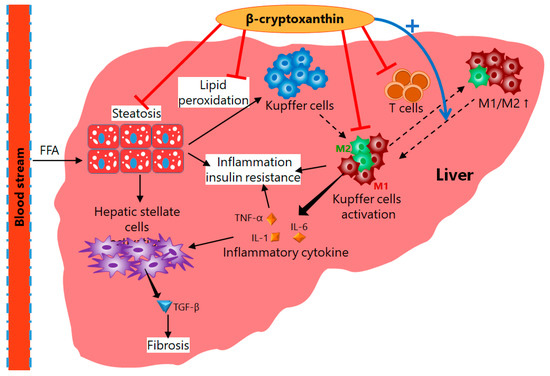 Control mechanism of dietary β-cryptoxanthin against progression of NAFLD: β-Cryptoxanthin inhibits not only lipid accumulation but also acts as an antioxidant and suppresses lipid peroxidation and inflammation, and thus results in improved insulin resistance in the liver. Additionally, β-cryptoxanthin prevents Kupffer cell activation by changing the M1/M2 status to M2 predominant. Consequently, β-cryptoxanthin controls progression of NAFLD by various biological and defensive activities.