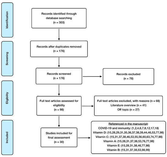 Bibliographical research started in early March 2021 until the end of July 2021, when the current review was conducted. The search was focused on the period between 2019 and 2021, through the main biomedical sources and databases: Medline (via PubMed), Elsevier, The Cochrane Library, and Dialnet. Only relevant articles published in recent years were accepted, and all of them were related to the subject of this study. Attention was preferentially paid to those related to COVID-19 and the association that vitamins could have with it. The search was entirely made in English, as it is the lingua franca used in the scientific field. Key words applied to do so have been COVID-19, SARS-CoV-2, vitamins, vitamin D, vitamin C, vitamin A, vitamin E, vitamin B, nutrition, nutrients, inflammation, and oxidative stress. Medical subject heading (MSH) terms were used in the words that may create misunderstandings in the browser. Boolean operators applied were “AND”, “OR”, and “NOT”. They were combined with key words to find valuable articles for this review. “AND” was used between every word in order to provide the search with more sensitivity and specificity, “OR” was used to connect synonyms, and “NOT” was not frequently used to avoid confusion in the browser.