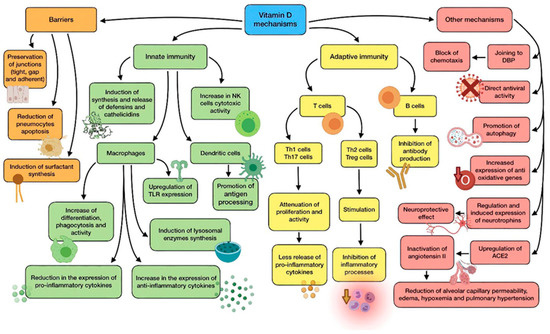 Vitamin D shows a great variety of mechanisms by which it protects against microbial infection, possibly reducing the risk of poor prognosis and death. They can be classified into three general categories: maintenance of physical barriers, improvement of innate immunity, and enhancement of adaptive immunity [30].