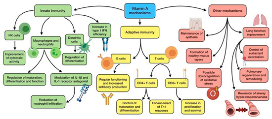 Systematic reviews and meta-analyses have reported that retinoid administration improves symptoms related to acute pneumonia, and also reduces incidence, morbidity, and mortality of measles [83]. However, and in spite of all the mechanisms previously cited, there is a lack of direct clinical evidence linking vitamin A supplementation to enhanced resistance to infection [84].