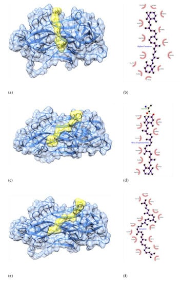 Interaction between the first ranked compound (α-carotene) with BDNF (a,b). Interaction between the second-ranked compound (β-cryptoxanthin) with the target BDNF protein (c,d). Interaction between the third-ranked compound (lycopene) with BDNF protein (e,f). In 3D interaction figures, BDNF is shown in blue and compounds in yellow).