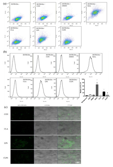 CLA pretreatment ameliorated the accumulation of reactive oxygen species (ROS) caused by LPS challenge in BMECs. (a) BMECs distribution diagram marked with green fluorescence probe DCFH-DA, which accurately represents the ROS concentration precisely. (b) The fluorescence intensity histogram, and the median of the fluorescence intensity was statistically analyzed. The data are presented as the means ± SEM. Experiments were repeated three times independently with triplicates in each treatment. * p ≤ 0.05, significantly different from CON; # p ≤ 0.05, significantly different from LPS. (c) ROS was marked with green fluorescence probe DCFH-DA and visualized by laser confocal microscopy. The T-PMT model was used to observe cell morphology and positioning.