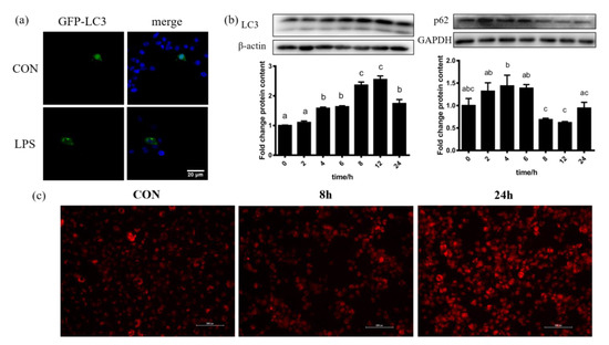 LPS challenge stimulated autophagy in BMECs. (a) BMECs transfected with GFP-LC3 plasmid expressed more green blots after challenged with LPS. (b) Immunoblotting of LC3B and p62 measured by Western blotting under treatment of LPS for 0, 2, 4, 6, 8, 12 and 24 h showed the occurrence of autophagy flow. (c) The fluorescence intensity of lysosomes in BMECs stained by red fluorescent probe Lyso-Tracker Red increased with the increase in LPS challenge time. The data are presented as the means ± SEM. Experiments were repeated three times independently with triplicates in each treatment. Different letters between groups represent significant differences with p ≤ 0.05.