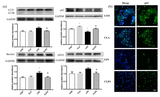 The protein abundance of autophagy related proteins, including LC3B, Beclin 1 and ATG5, was upregulated by LPS challenged, while CLA pretreatment reversed this effect (Figure 5a). The protein abundance and immunofluorescence intensity of p62 (Figure 5a,b) was decreased by LPS treatment, while CLA pretreatment increased the protein abundance and immunofluorescence intensity of p62.