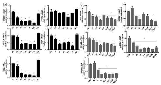 SREBP1 and PPARG are two important transcription factors that regulate milk fat synthesis. The mRNA abundance of SREBP1 in BMECs was significantly decreased by 8 μg/mL LPS treatment for different times, and the mRNA expression of PPARG was also remarkably decreased by LPS treatment for 8 h. For the key enzymes of fatty acid metabolism, the mRNA abundance of ACACA, FASN and SCD was distinctly decreased between 4 h and 12 h after LPS treatment. According to the above results (Figure 6a), cells were treated with 8 μg/mL LPS for 12 h in subsequent experiments.