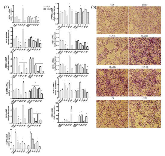 Compared with the control group, 50 and 100 μM CLA treatment for different times in BMECs was found to have different effects on milk fat synthase. Furthermore, 50 μM CLA treatment for 6 h, 12 h and 48 h could significantly reduce the mRNA abundance of transcription factor SREBP1 and milk fat synthase ACACA, FASN, ACSS2 and SCD. However, the mRNA abundance of SREBP1, PPARG, ACACA, FASN, ACSL1, DGAT1, DGAT2, SCD and FABP3 was significantly increased after the 24-h treatment, and the mRNA abundance of CD36 was significantly increased after the 48-h treatment. For the 100 μM CLA treatment, PPARG (for 6 h and 12 h), DGAT1 (for 6–24 h), DGAT2 (for 6 h), CD36 (for 6 h, 12 h and 48 h) and FABP3 (for 6 h and 24 h) were significantly increased for different treatment time, respectively (Figure 7a). Combined with the above results, 24 h 50 μM CLA treatment was used in subsequent experiments.