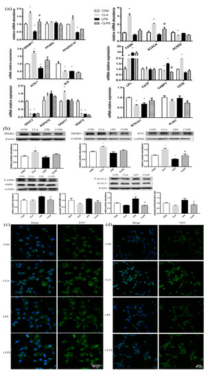 CLA treatment alone enhanced the fluorescence intensity of SREBP1 combined with aggregation towards the nucleus. LPS stimulation significantly reduced the fluorescence intensity of SREBP1, and the imagined aggregation towards the nucleus disappeared. In the CLPS group, the fluorescence intensity of SREBP1 was stronger than that of the LPS group (Figure 8d). Compared with the distribution of SREBP1, PPARG was always located in the nucleus and was not affected by various treatments, while the overall fluorescence intensity was affected by various treatments. CLA treatment alone enhanced the fluorescence intensity of PPARG, while LPS treatment reduced the fluorescence intensity of PPARG. The fluorescence intensity of PPARG in the CLPS group was stronger than that in the LPS group (Figure 8c).