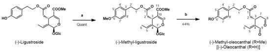 Synthesis of (−)-methyl-oleocanthal from (−)-ligustroside. Reagents and conditions: (a) CH2N2/Et2O; (b) H2O-DMSO, MW, 180 °C, 9 min.