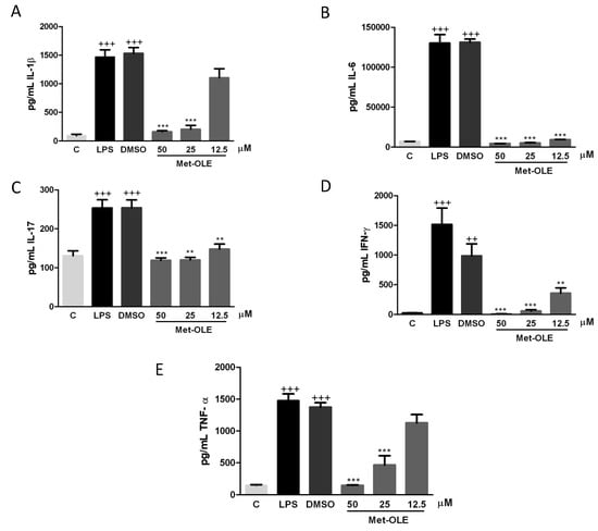 To explore the effects of met-OLE on pro-inflammatory cytokine production, we evaluated IL-1β, IL-6, IL-17, IFN-γ and TNF-α levels. As shown in Figure 3, after 18 h of exposure to LPS, murine cells exhibited higher levels of pro-inflammatory cytokines than unstimulated control cells (++ p < 0.01; +++ p < 0.001 vs. unstimulated cells). On the contrary, when cells were treated with met-OLE, we observed a significantly down-regulation of IL-1β, IL-6, IL-17, IFN-γ and TNF-α secretions when compared to the LPS-DMSO group (** p < 0.01; *** p < 0.001 vs. LPS-DMSO stimulated cells).
