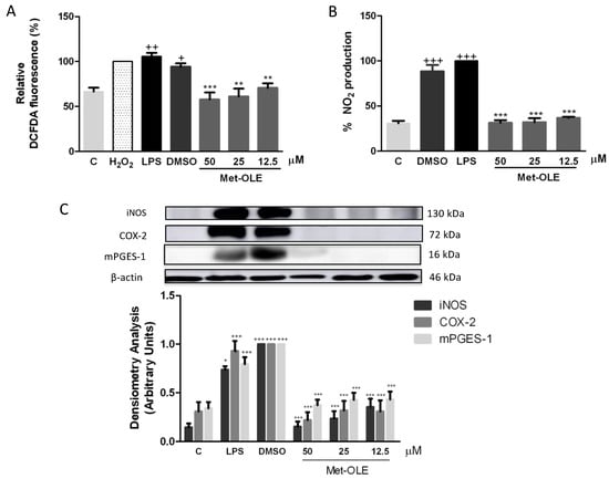 Effects of met-OLE on (A) intracellular ROS and (B) NO production and (C) overexpression of the iNOS, COX-2 and mPGES-1 proteins. Macrophages were pretreated with met-OLE (50, 25 or 12.5 μM) for 30 min and then, LPS-stimulated during 18 h. Subsequently, ROS and NO levels were measured using DCFDA and Griess assays in supernatants, respectively. The expression of iNOS, COX-2 and mPGES-1 proteins was then measured in whole cell lysates and analyzed by Western blotting. Results are presented as mean ± SEM of at least six independent experiments. + p < 0.05; ++ p < 0.01; +++ p < 0.001 vs. unstimulated control cells; ** p < 0.01; *** p < 0.001 vs. LPS-DMSO stimulated cells.