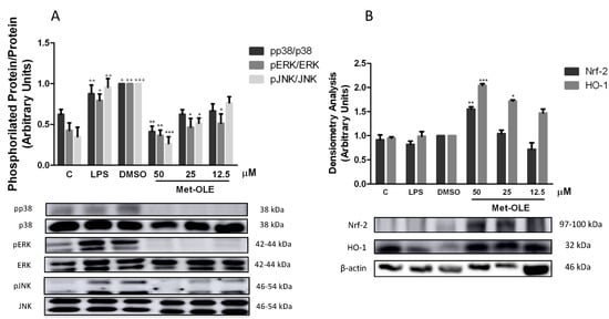 LPS-induced signaling pathways include MAPKs, a subfamily of serine/threonine-specific protein kinases family whose phosphorylation is significantly induced by LPS in macrophages, initiating inflammatory gene expression, including, in particular, iNOS and COX-2. MAPKs include three main members: p38, JNK and ERK. In this sense, inhibition of p38 MAPK has been shown to effectively alleviate inflammatory diseases, including rheumatoid arthritis, asthma, cardiovascular disease, Alzheimer’s disease, osteoarthritis and inflammatory pain [34]. Thus, MAPKs inhibitors are considered novel potential drug candidates for inflammation-related diseases. In the present study, we reported that met-OLE suppressed MAPKs’ phosphorylation in a concentration-dependent manner. These results are in line with those from our previous studies, which reported that MAPKs’ activation was drastically inhibited by OLE in LPS -induced murine macrophages [14], as well as in the paws of arthritic animals fed with this EVOO phenol [15].