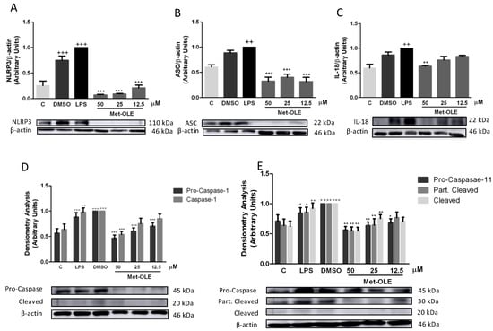 The protein expressions of the non-canonical pathway were then analyzed. As shown in Figure 5E, the expressions of pro-caspase-11, partially cleaved and cleaved caspase-11 were significantly reduced in cells incubated with met-OLE incubated cells (* p < 0.05; ** p < 0.01; *** p < 0.001 vs. LPS-DMSO stimulated cells). Lastly, in accordance with previous results, the expression levels of the mature form of IL-18 were measured, showing a significant reduction after met-OLE 50 μM treatment (** p < 0.01 vs. LPS-DMSO stimulated cells) (Figure 6C).
