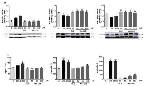 In an attempt to elucidate the role of epigenetic histone mechanisms underlying met-OLE’s anti-inflammatory effects, we explored met-OLE-induced epigenetic changes in histone markers and cytokine-correlated production, compared to OLE. We isolated histones from mice spleen cells and measured their expression by Western blot. A total of three H3 histone modifications were evaluated on several lysine residues: H3K18ac, H3K9me3 and H3K27me3. Acetylation of H3 is associated with the induction of expression, while methylation is a repressive marker. Consistent with that, basal levels of H3K18ac were induced, as well as H3K9me3 and H3K27me3 being significantly decreased after exposure to LPS exposition (+ p < 0.05; ++ p < 0.01 vs. unstimulated cells). Surprisingly, as shown in Figure 7A, pretreated cells with OLE and met-OLE counteracted LPS induction, preventing H3K18 acetylation or H3K9 and H3K27 demethylation (* p < 0.05; ** p < 0.01 vs. LPS-DMSO stimulated cells). Subsequently, we next evaluated the levels of several modulated cytokines that have been associated with the markers of these histones in their promoter regions. Particularly, levels of IL-17, IL-1β and IL-6 were up-regulated after LPS stimulation (+ p < 0.05; ++ p < 0.01; +++ p < 0.001 vs. unstimulated cells), while the treatments with OLE and met-OLE were able to considerably reduce them. These results with previous results obtained for the histones’ modifications (* p < 0.05; ** p < 0.01; *** p < 0.001 vs. LPS-DMSO stimulated cells) (Figure 7B).
