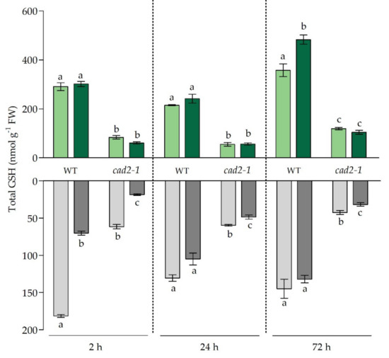 - Jozefczak, M.; Bohler, S.; Schat, H.; Horemans, N.; Guisez, Y.; Remans, T.; Vangronsveld, J.; Cuypers, A. Both the concentration and redox state of glutathione and ascorbate influence the sensitivity of Arabidopsis to cadmium. Annals of Botany 2015. [Google Scholar] [CrossRef] [PubMed]
