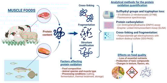 Schematic representation of the main mechanisms and factors that affect protein oxidation, different analytical methods for quantifying protein oxidation, and the detrimental effects of protein oxidation on muscle food quality.