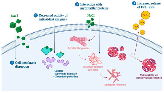 The inclusion of salt in muscle foods can also interfere with lipid and protein oxidation. However, there is controversy about its role, whereas while some studies point the oxidation promoting effect of salt, others have not found a significant relationship [47]. For those who support the pro-oxidant effect of salt, the responsible mechanism of action is thought to be related to (1) cell membrane disruption, (2) decreased activity of antioxidant enzymes, and (3) the increased release of Fe3+ ions and the formation of ferrylmyoglobin and metmyoglobin (Figure 3) [4,46,49]. Moreover, the inclusion of salt has been shown to promote protein and lipid oxidation when combined with other techniques such as drying or fermentation, or with the addition of nitrates and/or nitrites (which is defined as the curing process) [4,47,69]. For instance, curing has demonstrated the ability to affect protein oxidation and proteolysis, which can produce unpleasant effects on the organoleptic properties of further processed meat products [52] (Table 1). In this same perspective, the role of other techniques or pretreatments coupled with salt inclusion must be considered. A recent study assessed the effect of pulsed electric field (PEF) pretreatment on sea bass. PEF can cause a temperature increase and, therefore, an enhanced production of free radicals that lead to protein and lipid oxidation [45]. More specific studies have revealed that NaCl directly affected myofibrillar proteins by irreversibly unfolding their secondary structure, rupturing hydrogen bonds, and causing hydrophobic interactions to occur, while also promoting the formation of aggregates [70].