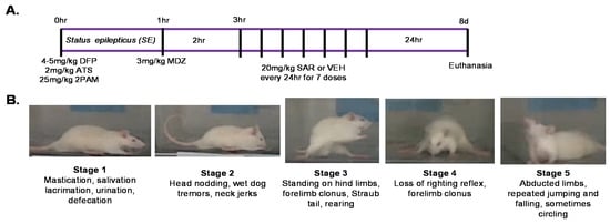 We used a total of 103 animals in this study. We had four treatment groups as listed in Table 1; PBS + VEH, PBS + SAR, DFP + VEH, and DFP + SAR. Animals were administered 4 mg/kg (males) or 5 mg/kg (females) DFP (s.c.) or PBS as a control. DFP or PBS administration was randomized. We decided to increase the dose in females due to the increased resistance of females to develop seizures following DFP in our previous publication []. Immediately after the administration of DFP, animals were administered 2 mg/kg ATS and 25 mg/kg pralidoxime (2 PAM, i.m.) to reduce mortality. The experimental timeline is illustrated in Figure 1A. Around 5–10 min after DFP administration, animals began displaying behavioral seizures. We ranked these seizures using a modified Racine scale in which stages 1–2 are considered non-convulsive seizures (NCS) and stages 3–5 are considered convulsive seizures (CS) []. Behavioral features are described and depicted in Figure 1B. Stage one seizures involve salivation, lacrimation, urination, defecation, and mastication, while stage two involves the addition of head nodding and tremors. Stage three is characterized by rearing, forelimb clonus, and Straub tail; stage four is characterized by loss of the righting reflex, while stage five seizures are characterized by circling and repeated falling. For the 8-day group, MDZ was administered one hour after DFP intoxication (n = 33). The number of animals (n) used as controls, VEH, DFP with VEH/SAR are listed in Table 1. For the 10-week group, MDZ was administered after the animals displayed 20 min of CS (n = 32). For animals that did not reach 20 min of CS, MDZ was administered one hour after DFP administration. Treatments were assigned in a randomized block design based on the number of minutes in CS in order to mitigate the effects of SE severity in epileptogenesis. SAR or VEH was administered two hours after MDZ in order to account for the time it would take a patient to reach the hospital in a real-world scenario. In both groups, 20 mg/kg SAR (p.o.) or VEH was administered every 24 h for 7 total doses. Animals were administered saline (1 mL, s.c.) and nutrical (Midwest Veterinary Supply) twice a day for at least the first three days until the animals gained weight. Animals were handled twice a day for the duration of the treatment period and were assessed for the occurrence of SRS (induced due to handling) and morbidity.