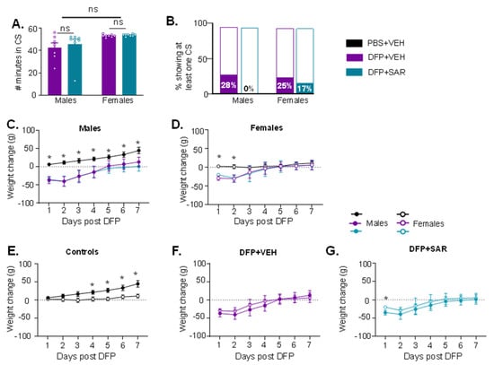 We challenged males with 4 mg/kg and females 5 mg/kg DFP, or an equal volume of VEH, followed by 2 mg/kg ATS, 25 mg/kg 2-PAM (immediately) and MDZ (after one hour). There were no differences in the initial SE severity between animals that were used to treat with SAR or VEH or for either sex, nor were there sex differences (Figure 2A). None of the VEH-treated males or females died, while 2/10 males (2 and 6 days post-DFP) and 2/8 females (2 and 4 days post-DFP) treated with SAR died. Further, 28% of VEH-treated males (n = 7) and 25% of VEH-treated females (n = 8) had at least one CS during handling compared to none in SAR-treated males (n = 8) and 17% in SAR-treated females (n = 6) (Figure 2B). The differences were not significantly different between VEH- and SAR-treated animals. DFP intoxication led to significant weight loss for the first 3–4 days post-exposure in both males and females, and SAR treatment had no effect (Figure 2C,D). We also compared males and females in each treatment group (Figure 2E–G). Male controls gained weight significantly quicker than female controls (Figure 2E). There were no differences in weight loss between sexes for DFP-treated animals, with the exception of the first day of DFP and SAR males compared to DFP and SAR females (Figure 2G).