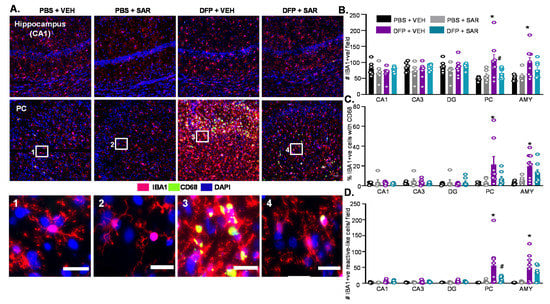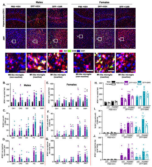 The number of IBA1 positive cells, the number of CD68 positive cells, and the number of IBA1 positive cells with reactive morphology (M1-like) were quantified. Reactive microglia have large cytoplasm and short processes in contrast to non-reactive microglia, which have small cell bodies and long processes []. Representative images of IBA1 and CD68 from CA1 of the hippocampus and the AMY are presented in Figure 3A. As expected, we found significant upregulation of IBA1 positive cells in DFP- and VEH-treated males and females compared to respective control in all regions of the brain (Figure 3B,E). This was not significantly mitigated by SAR in most regions except in the AMY in females (Figure 3E). There was also a significant upregulation of the percent of IBA1 positive cells with CD68 in DFP-treated males and females (both SAR and VEH) compared to controls in the DG, PC, and AMY (Figure 3C,F). There was also a significant upregulation of the number of IBA1 positive cells with reactive morphology in the PC and AMY (Figure 3D,G). Overall there were minimal sex differences in the number of IBA1 positive cells, percent cells with CD68, and the number of reactive-like microglia (Figure 3H–J). The only significant difference was in the percent cells with CD68, in which females had significantly less than males in the PC/AMY region in the SAR-treated group (Figure 3I).