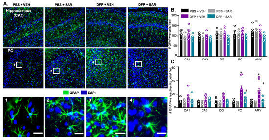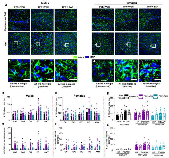 We counted the total number of GFAP positive cells and the number of GFAP positive cells with reactive morphology. Reactive cells had retracted processes and large cell bodies []. Representative images of astrogliosis in the hippocampus (CA1) and AMY from both male and female groups are shown in Figure 4A. Interestingly, DFP and SAR treatment did not lead to a significant change in the number of GFAP positive cells with the exception of DFP and VEH males in the PC (Figure 4B,D). However, in males, all regions of the brain had significant upregulation in reactive astrocytes by DFP and significant reduction by SAR treatment in the hippocampal regions (Figure 4C). In females, there was also an increase in GFAP positive cells with reactive morphology, but the mitigation by SAR was not as significant as in males (Figure 4E). There were no significant sex differences in the hippocampus or AMY/PC region for the number of GFAP positive cells or the number of GFAP positive cells with reactive-like morphology in any treatment group (Figure 4F,G).