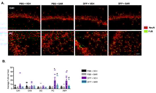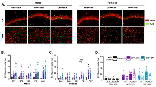 We found FJB positive cells that were colocalized with NeuN as well as FJB positive cells without NeuN positive staining, as reported in our previous publication []. We counted both colocalized cells and FJB cells without NeuN in our assessment of neurodegeneration since NeuN was expected to downregulate in some neurons in response to stress []. Representative images from the hippocampus (CA1) and AMY are shown in Figure 5A. DFP-treated males and females had increased FJB positive cells in all regions of the brain, though it was only significant in some regions (Figure 5B,C). This was not significantly mitigated by SAR treatment. There were no sex differences in the number of FJB positive cells for any group in any brain regions investigated (Figure 5D).