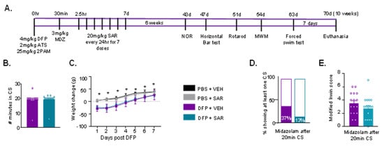 We recently tested the short-term effects of SAR in animals that had about 20 min of convulsive seizures after DFP intoxication []. These animals did not develop SRS during the treatment period and had significantly reduced neurodegeneration compared to the VEH-treated group when tested 24 h after the last day of SAR treatment (i.e., 8 days post-DFP) []. Notably, the SAR-treated animals had significant weight loss compared to VEH controls. In that study, we administered 25 mg/kg SAR, beginning 4 h after DFP intoxication, twice daily at 12 h intervals during the first three days, followed by a single dose per day for the next four days []. In this study, we tested 20 mg/kg per day for 7 days to minimize toxicity and increase the efficacy of the drug. We also tested the short-term (8 days, in both sexes) and the long-term (10 weeks, males only) impact of this dosing regimen. We hypothesize that SAR administration with this dosing regimen for a week will mitigate DFP-induced brain pathology and morbidity.