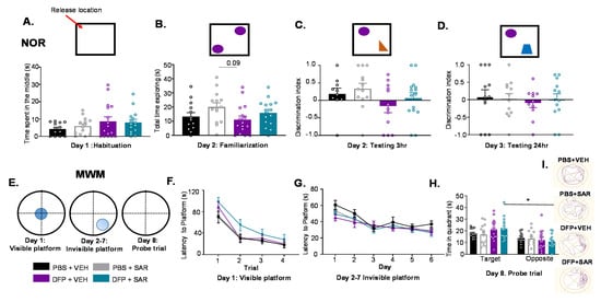Effects of DFP and SAR or VEH on learning and memory in the novel object recognition test (NOR) and Morris water maze (MWM). (A–D) Experimental design for the NOR is illustrated in boxes. (A) On the first day (habituation) animals were allowed to explore the empty apparatus, a large square arena (100 cm2). Amount of time spent in the center of the apparatus for each treatment group is presented. (B) On the next day (familiarization), animals were placed into the same apparatus with two identical objects; amount of time animals spent exploring the objects is presented. (C) Three hours later, one of the objects was replaced with a novel object. (D) 24 h post-familiarization, a new novel object replaced the previously used novel object. Higher discrimination indices indicate a greater proportion of time spent with the novel object. (E) Experimental design for the MWM. The apparatus consisted of a large tank (60 cm high, 180 cm diameter) filled with water; several visually distinct cues lined the tank. On the first day, a visible platform was placed in the center of the tank; animals were trained to reach the platform. On days 2–7, animals were trained (4 trials a day) to find an invisible platform using the cues. On the 8th day, animals were released into the tank without a platform and time spent in the target quadrant (prior platform location) was measured (probe trial). (F) Time to the visible platform for four trials during the first day of training. (G) Time to the invisible platform on days 2–7 of training. (H) Time spent in the target and opposite quadrant during the probe trial. (I) Representative trial plots from each group. All, n = 13–16, ANOVA, or mixed measures ANOVA. * p < 0.05; p-values indicated numerically when p < 0.1.