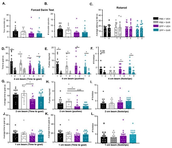 Effects of DFP and SAR or vehicle on depression (forced swim test), anxiety (forced swim test and horizontal bar tests), and motor coordination (horizontal bar test and rotarod). (A,B) Immobility time (A) and number of immobile episodes (B) in the forced swim test. (C) Latency to fall on the rotarod for two days of training is plotted. The numbers (1, 2) represent days of testing. (D–L) The horizontal bar tests. (D,G,J) Time to the safety box, (E,H,K) and number of pushes required, and (F,I,L) the number of foot slips on the first two days of training and 24 h after training on 4 cm, 2 cm, and 1 cm bars. All, n = 13–16, ANOVA or mixed measures ANOVA. * p < 0.05; p-values indicated numerically when p < 0.1.