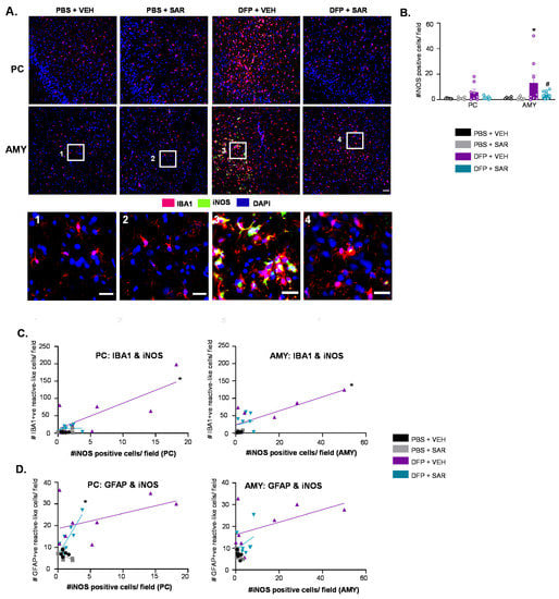 Representative images of iNOS for each treatment group are shown in Figure 12A. iNOS was primarily localized in microglia (IBA1 positive cells); we therefore only counted iNOS positive cells that were colocalized with IBA1. There was a significant upregulation of iNOS in DFP- and VEH-treated animals in the AMY with significant mitigation by SAR (Figure 12B). There was also upregulation of iNOS in the PC, but this was not significant. We hypothesized that the degree of iNOS positive cells might be indicative of the degree of glial activation. A simple linear regression showed a significant correlation between the number of IBA1 positive cells with reactive morphology and the number of iNOS positive cells in the DFP and VEH group, but not the other groups (Figure 12C, PC, R2 = 0.577, AMY R2 = 0.660). There was also a significant correlation between the number of iNOS positive cells and GFAP positive cells with reactive morphology in the PC of the DFP and SAR group (Figure 12D, R2 = 0.737).
