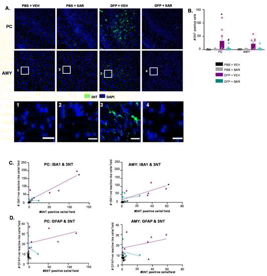 Representative IHC images of 3NT for each treatment group are shown in Figure 13A. There was little-to-no staining in control animals and DFP and SAR animals. There was upregulation of 3NT in the DFP and VEH in both the PC and AMY (Figure 13B). In the PC, SAR significantly mitigated DFP-induced upregulation of 3NT (Figure 13B). Following a simple linear regression analysis, we found a significant correlation between the number of 3NT positive cells and the number of reactive type IBA1 positive cells for the DFP and VEH group in both the PC (R2 = 0.784) and AMY (R2 = 0.541) (Figure 13C). This was similar for the DFP and SAR group in the PC (R2 = 0.856) and AMY (R2 = 0.825) (Figure 13D). Interestingly, there was no significant correlation for any group in any location between the number of 3NT positive cells and reactive type GFAP positive cells. There were no significant changes in the expression of 3NT in the PC/AMY region, as revealed by Western blotting (Figure S2A,B).