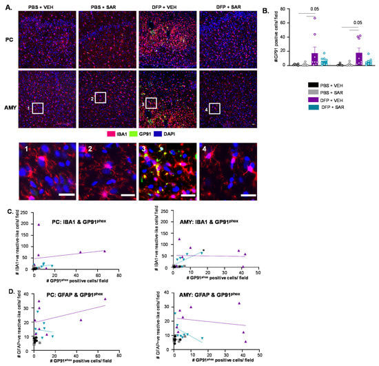 Representative IHC images of IBA1 and CD68 staining are shown in Figure 9A. Interestingly, in the hippocampus of the DFP and VEH group, there were no differences between the groups for the total number of IBA1 positive cells (Figure 9B), percent of IBA1 positive cells with CD68 (Figure 9C), or the number of IBA1 positive cells with reactive morphology (Figure 9D). However, we found a significant increase in all of these parameters for DFP- and VEH-treated animals in the PC and the AMY (Figure 9B–D). SAR treatment led to a reduction of IBA1 positive cells compared to DFP- and VEH-treated animals in the PC (significant) and AMY (not significant) (Figure 9B). Similarly, there was also a reduction in IBA1 cells with reactive morphology in DFP and SAR animals compared to DFP and VEH animals in the PC (significant) and AMY (not significant) (Figure 9D). DFP- and SAR-treated animals also had a reduction in the percent of CD68 positive cells compared to DFP and VEH in the PC and AMY, but the reduction was not statistically significant (Figure 9C).