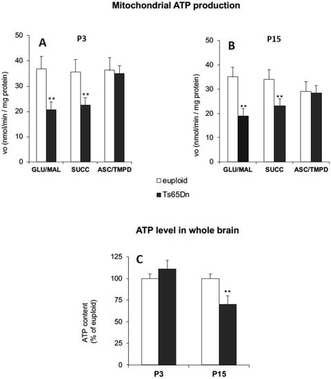 Our study provides novel evidence that the brain of neonate Ts65Dn mice exhibits defective functional activities of MRC complexes, i.e., complex I and ATP synthase, similar to the fibroblasts and lymphoblastoid cells from DS subjects [,,] as well as Ts65Dn-derived hippocampal NPCs [,] and brain cortex of Ts16 mice []. This confirms that the Ts65Dn mouse, the first viable trisomy model [], is a valid model for DS because it exhibits the mitochondrial phenotypic features of the syndrome very early during brain development, similarly to the DS condition. The level of ATP measured in the mouse brain was significantly lower in P15 mice, compared to euploid controls, thus suggesting that the inefficient mitochondrial ATP production found in Ts65Dn mice is an early event that translates into an alteration of the whole brain energy status. Interestingly, the mitochondrial energy deficit in P3 Ts65Dn mice was not associated with a decrease in the brain ATP content, suggesting that tentative compensatory events might occur early, such as an enhancement of glycolysis, as detected in foetal human Hsa21 fibroblasts [].