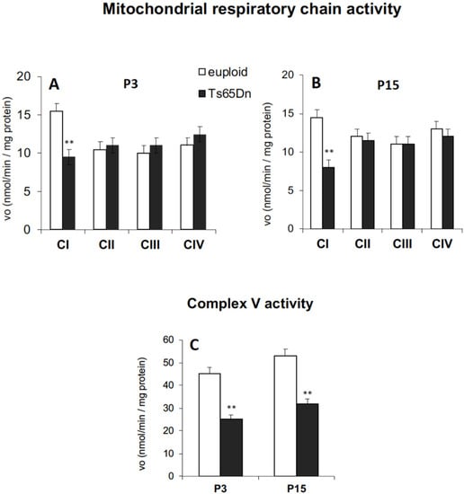 In accordance with the results obtained by monitoring mitochondrial ATP production by OXPHOS, and in line with the dysregulated MRC complex levels found in 1–9-month-old Ts65Dn mice [], functional analyses of all five MRC complexes revealed a significant reduction in the activities of complex I (Figure 2A,B) and ATP synthase (complex V) (Figure 2C) in both P3 and P15 Ts65Dn mice compared to their euploid controls.