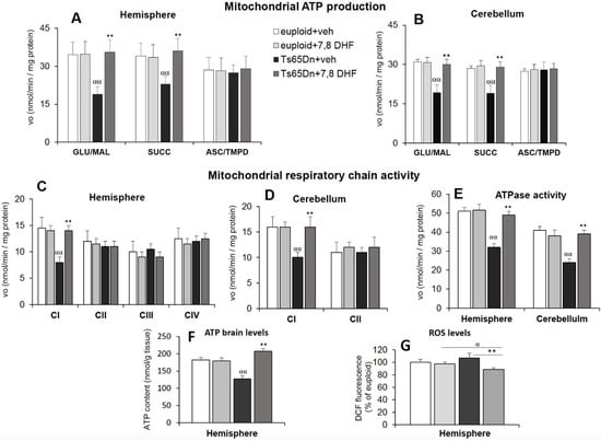 Neonatal treatment with 7,8-DHF improves the bioenergetic status in Ts65Dn mice. (A,B) Rate of ATP production was measured spectrophotometrically, as described in Figure 1, in isolated mitochondria from cryopreserved brain hemispheres (A) and cerebella (B) in the presence of the MRC respiratory substrates: glutamate plus malate (GLU/MAL), succinate (SUCC) or ascorbate plus TMPD (ASC/TMPD). Values are the mean ± SD of two independent measurements in 4 mice for each experimental group: vehicle-injected Ts65Dn mice (Ts65Dn + veh), 7,8-DHF-injected Ts65Dn mice (Ts65Dn + 7,8-DHF), vehicle-injected euploid mice (euploid + veh) and 7,8-DHF-injected euploid mice (euploid + 7,8-DHF). (C–E) Activity assays of complex I (CI), complex II (CII), complex III (CIII), complex IV (CIV) (C,D) and complex V (ATPase, CV) (E) were performed in mitochondrial membrane-enriched fractions from cryopreserved brain hemispheres and cerebella of vehicle-injected Ts65Dn mice (Ts65Dn + veh), 7,8-DHF-injected Ts65Dn mice (Ts65Dn + veh), vehicle-injected euploid mice (euploid + veh) and 7,8-DHF-injected euploid mice (euploid + 7,8-DHF). Rate values are the mean ± SD of two independent measurements in 4 mice for each experimental group, expressed as nmoles/min/mg protein. (F) Measurements of ATP brain levels were performed spectrofluorimetrically, as described in the Materials and Methods, in neutralized perchloric acid extracts of cryopreserved brain hemispheres of vehicle-injected Ts65Dn mice (Ts65Dn + veh), 7,8-DHF-injected Ts65Dn mice (Ts65Dn + veh), vehicle-injected euploid mice (euploid + veh) and 7,8-DHF-injected euploid mice (euploid + 7,8-DHF). Data are the mean ± SD of two independent measurements in 5 mice for each experimental group and expressed as nmoles ATP/g brain tissue. Significant differences between groups were calculated with one-way ANOVA and Tukey’s test. αα p < 0.01 Ts65Dn + veh vs euploid + veh; ** p < 0.01: Ts65Dn + 7,8-DHF vs Ts65Dn + veh vehicle. (G) ROS levels were detected as described in the Materials and Methods in cerebral hemisphere homogenates of vehicle-injected Ts65Dn mice (Ts65Dn + veh), 7,8-DHF-injected Ts65Dn mice (Ts65Dn + veh), vehicle-injected euploid mice (euploid + veh) and 7,8-DHF-injected euploid mice. Data are reported as the mean ± SD of 4 mice for each experimental group. ** = p < 0.01 Ts65Dn + 7,8-DHF vs. Ts65Dn + veh; α = p < 0.05 Ts65Dn + 7,8-DHF vs. euploid + veh by ANOVA with a post-hoc Turkey’s test.