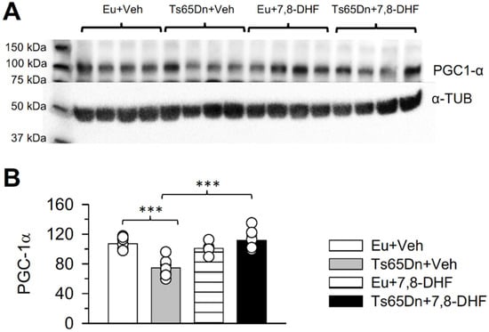 Outcome of treatment with 7,8-DHF in the neonatal period on PGC-1α expression in the hippocampal formation of Ts65Dn and euploid mice aged 15 days. Western blot analysis of PGC-1α expression in the hippocampus of P15 Ts65Dn and euploid mice treated either with vehicle (untreated mice) or 7,8-DHF (treated mice) during the postnatal days P3–P15. (A) Representative western blot images showing immunoreactivity for PGC-1α and the housekeeping gene α-Tubulin. (B) Levels of PGC-1α in the four experimental groups (untreated euploid and Ts65Dn mice and treated euploid and Ts65Dn mice). Values were normalized to α-Tubulin. Protein levels (mean ± SE) are expressed as a percentage of the values of untreated euploid mice. The scatterplots over each column represent the values of individual cases for each group. The following number of mice were analysed. Untreated euploid mice: n = 9; untreated Ts65Dn mice: n = 8; 7,8-DHF-treated euploid mice: n = 5; 7,8-DHF-treated Ts65Dn mice: n = 7. Two untreated euploid mice (yielding n = 7), one untreated Ts65Dn mouse (yielding n = 7), one 7,8-DHF-treated euploid mouse (yielding n = 4) and one 7,8-DHF-treated Ts65Dn mouse (yielding n = 6) were excluded from analysis based on the SPSS Box plot tool, as described in the Statistics section. *** p < 0.001 (Tukey’s test after two-way ANOVA). Abbreviations: 7,8-DHF, 7,8-dihydroxyflavone; α-Tub, α-Tubulin; Eu, euploid; Veh, vehicle.